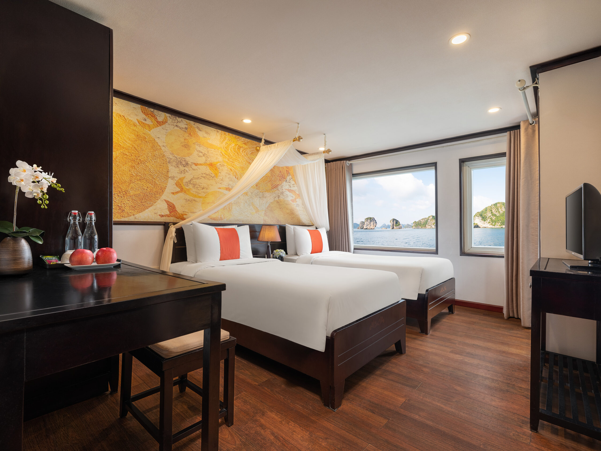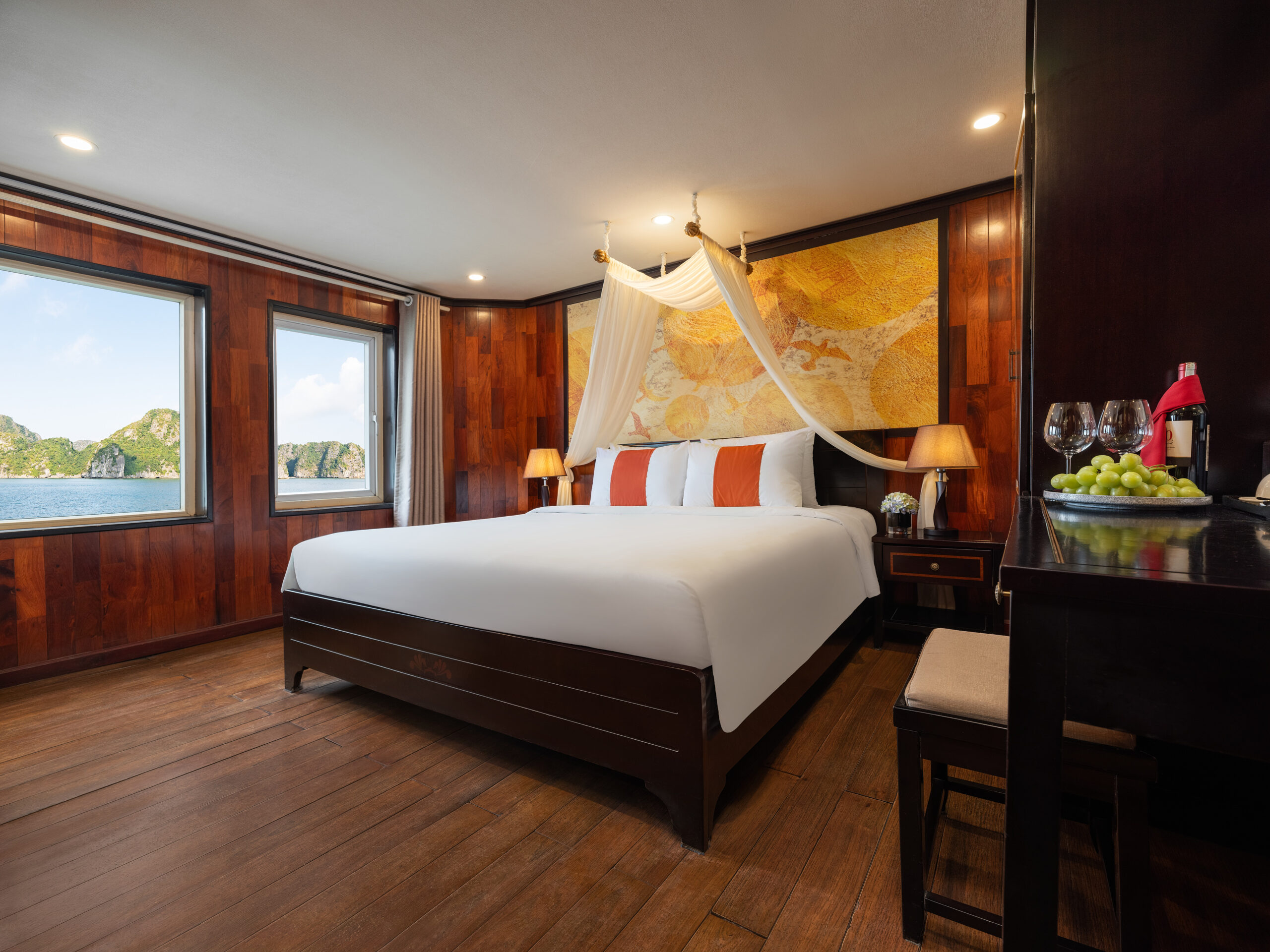 Amanda Premier Cruise is a 5-star luxury vessel featuring 25 modern cabins with full amenities. The 2 days 1 night itinerary offers guests a memorable journey through Halong Bay’s highlights including Luon Cave, Titop Island, and Sung Sot Cave, combined with onboard activities such as sunset party, cooking class, gala dinner, traditional performances, and relaxing spa experiences.