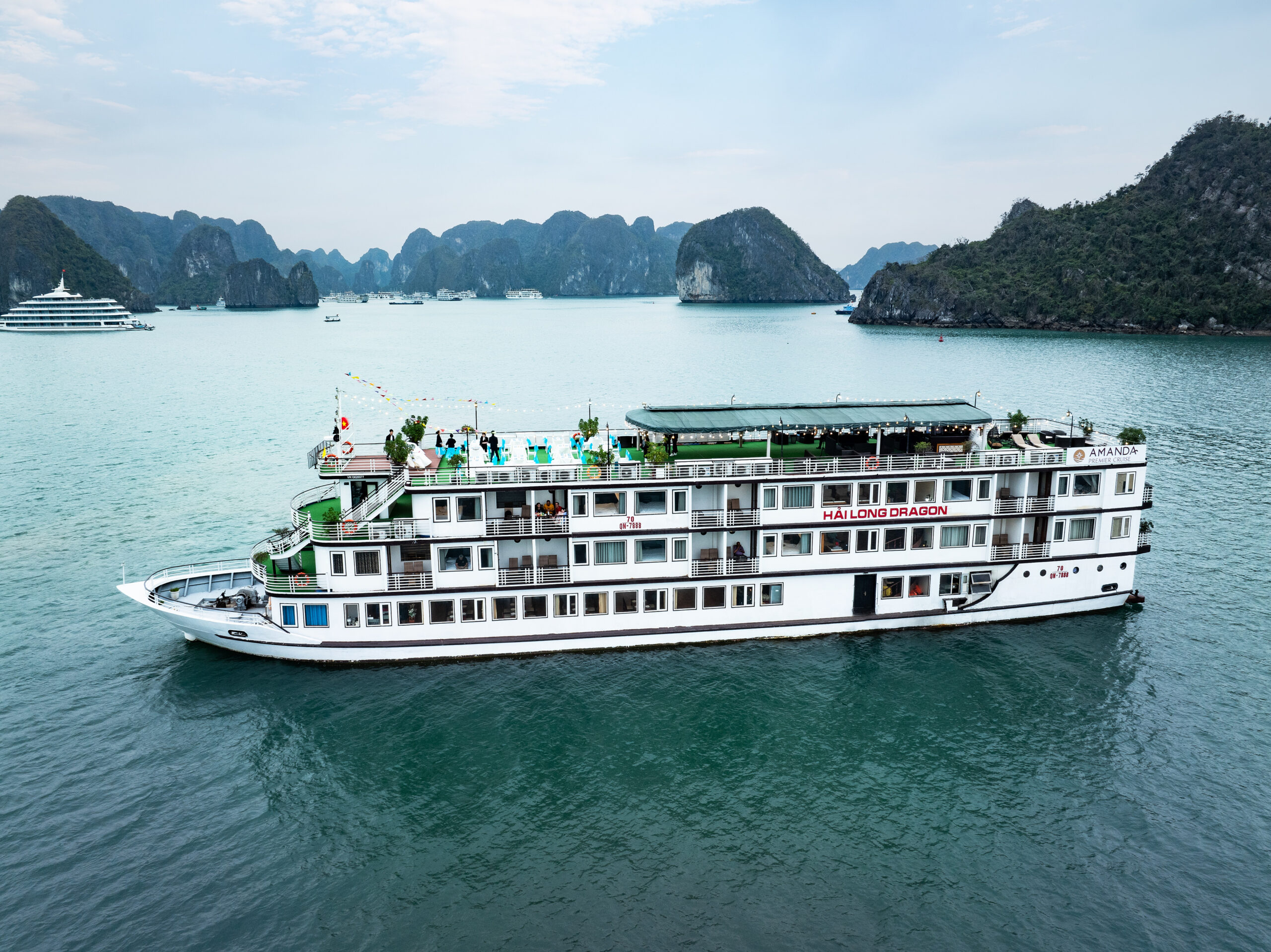 12:15: Embark Amanda Premier Cruise. Welcome drinks and cold towels, then check-in cabin. Cruise departs to explore Halong Bay, passing limestone islands en route to Luon Cave & Titop Island. Enjoy deluxe lunch onboard.