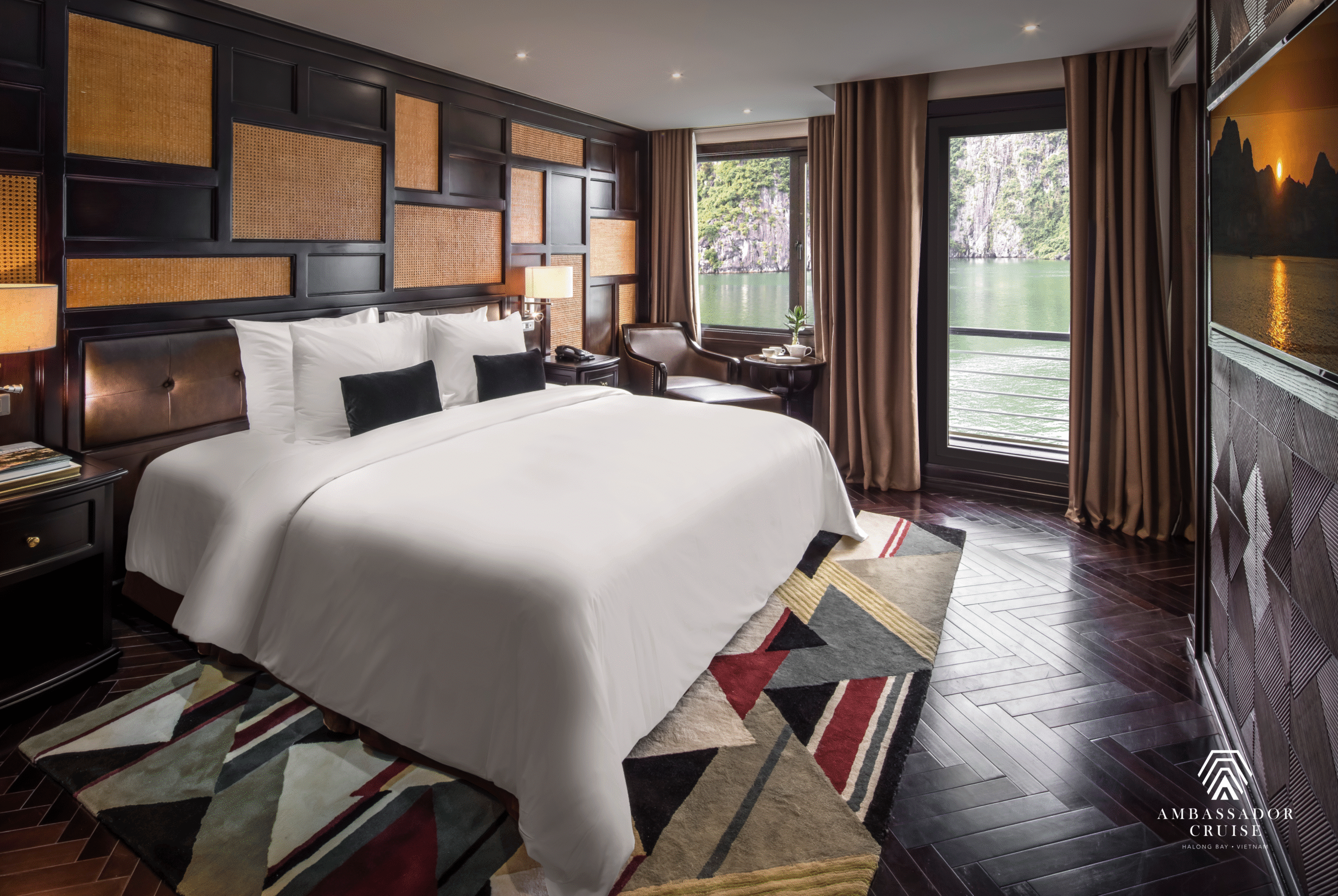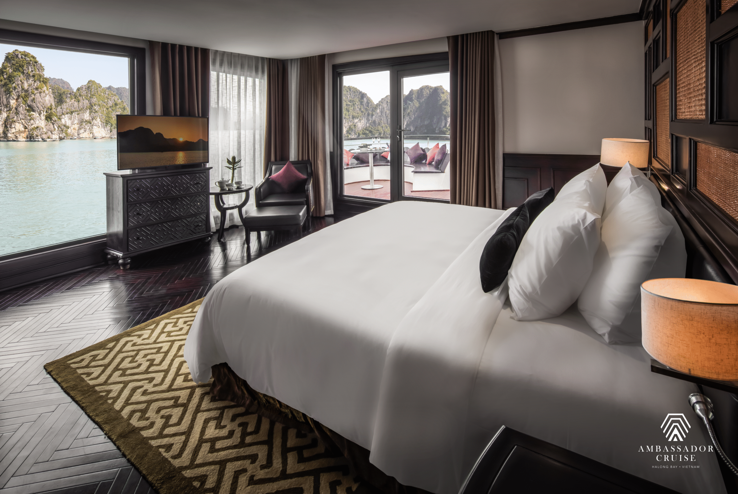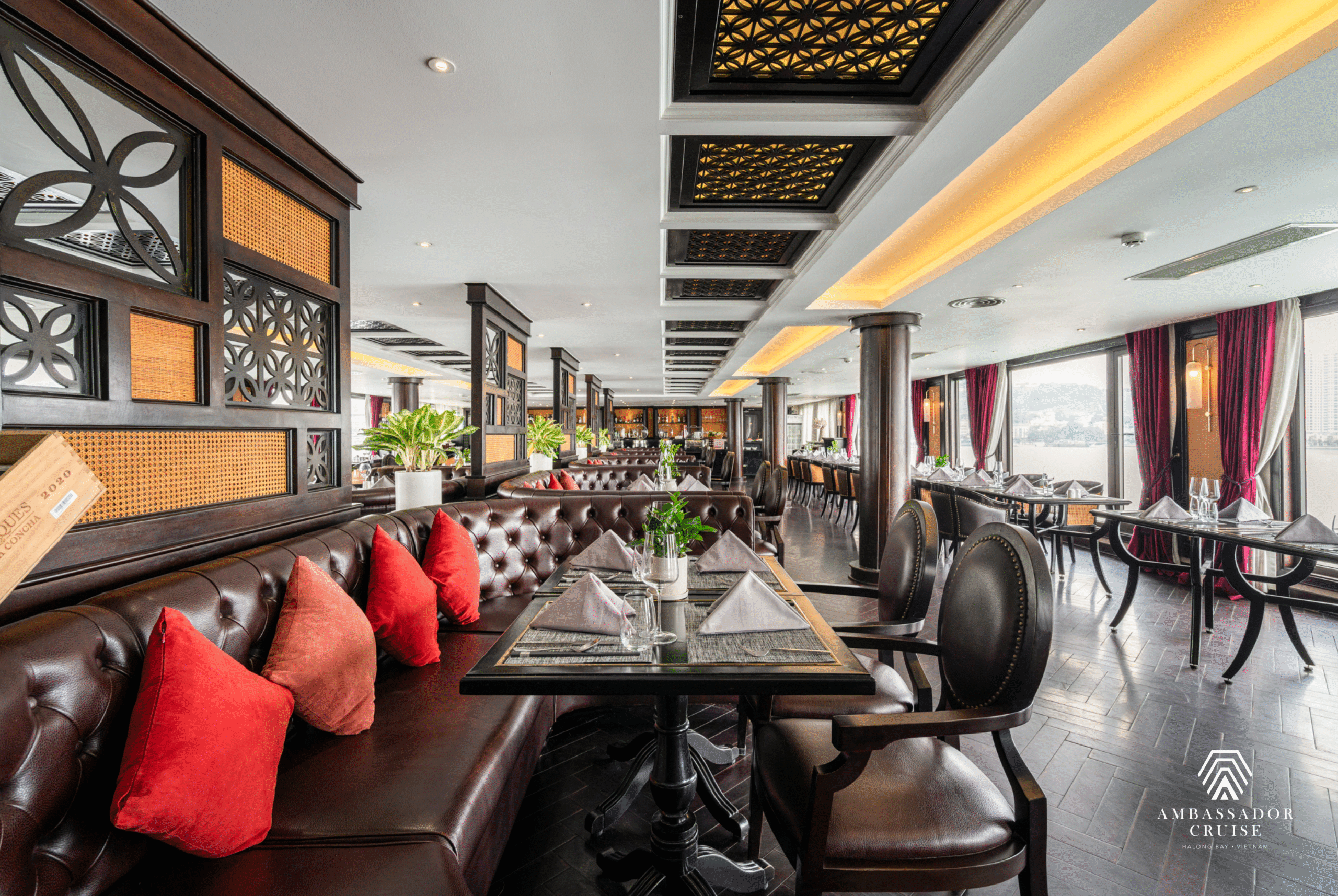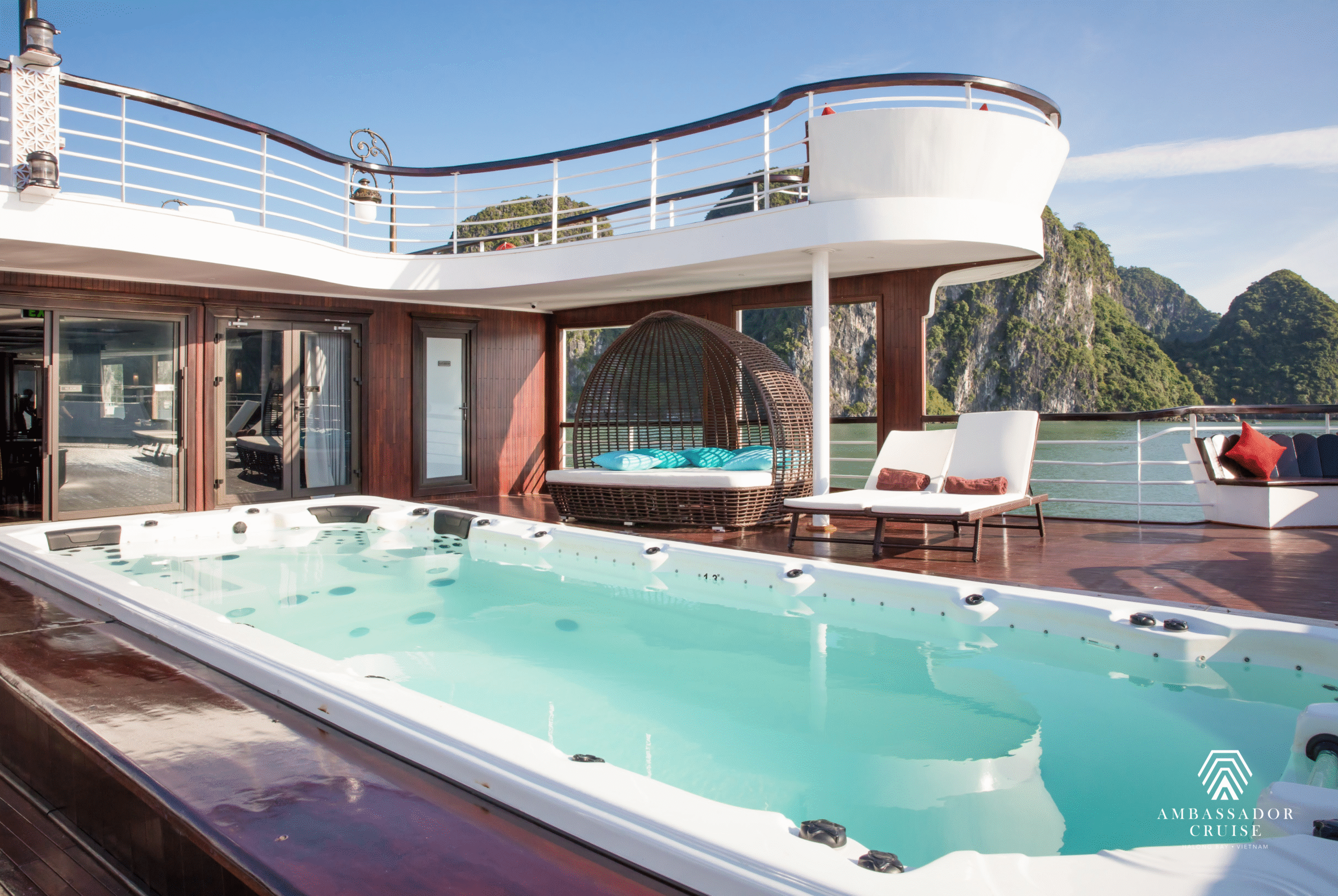 Launched in 2021, Ambassador I is one of the largest 5-star overnight cruises in Halong Bay, designed to deliver a luxurious and tranquil experience amidst the World Heritage Site. With a length of 86m, width of 13.9m, height of 13m, and a total capacity of 120 guests across 46 cabins, the cruise combines modern facilities with elegant services.