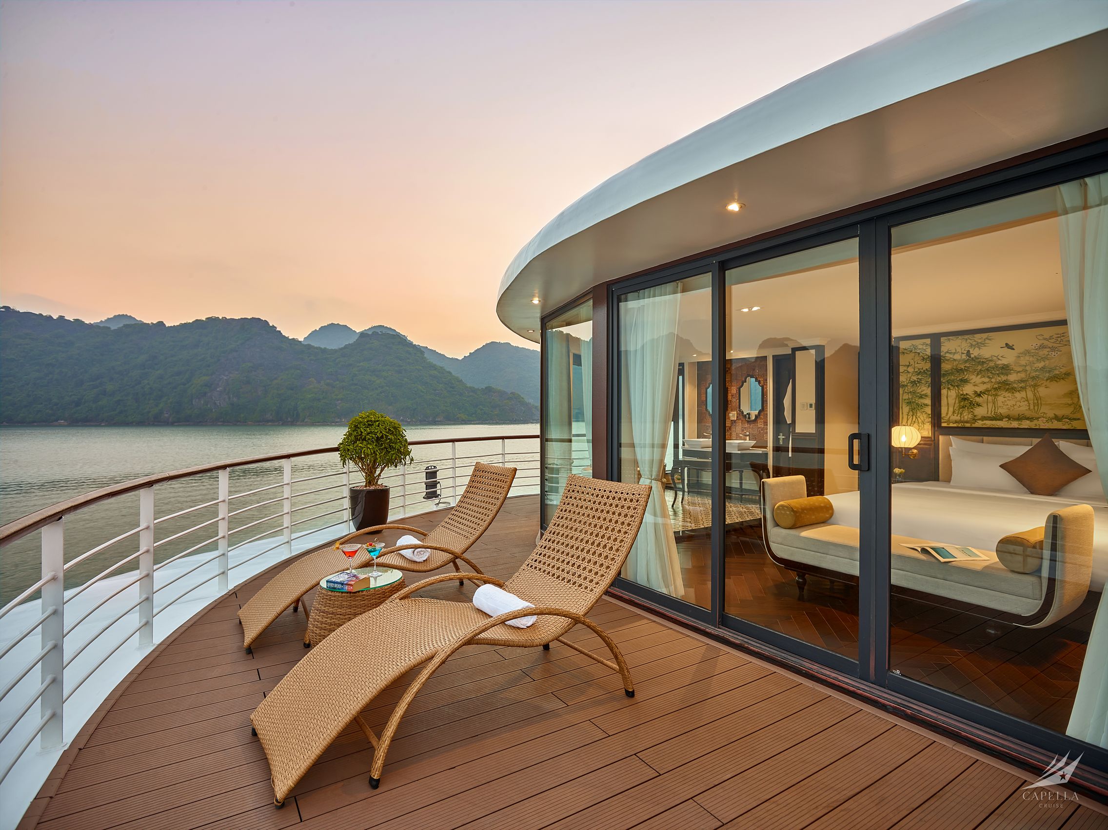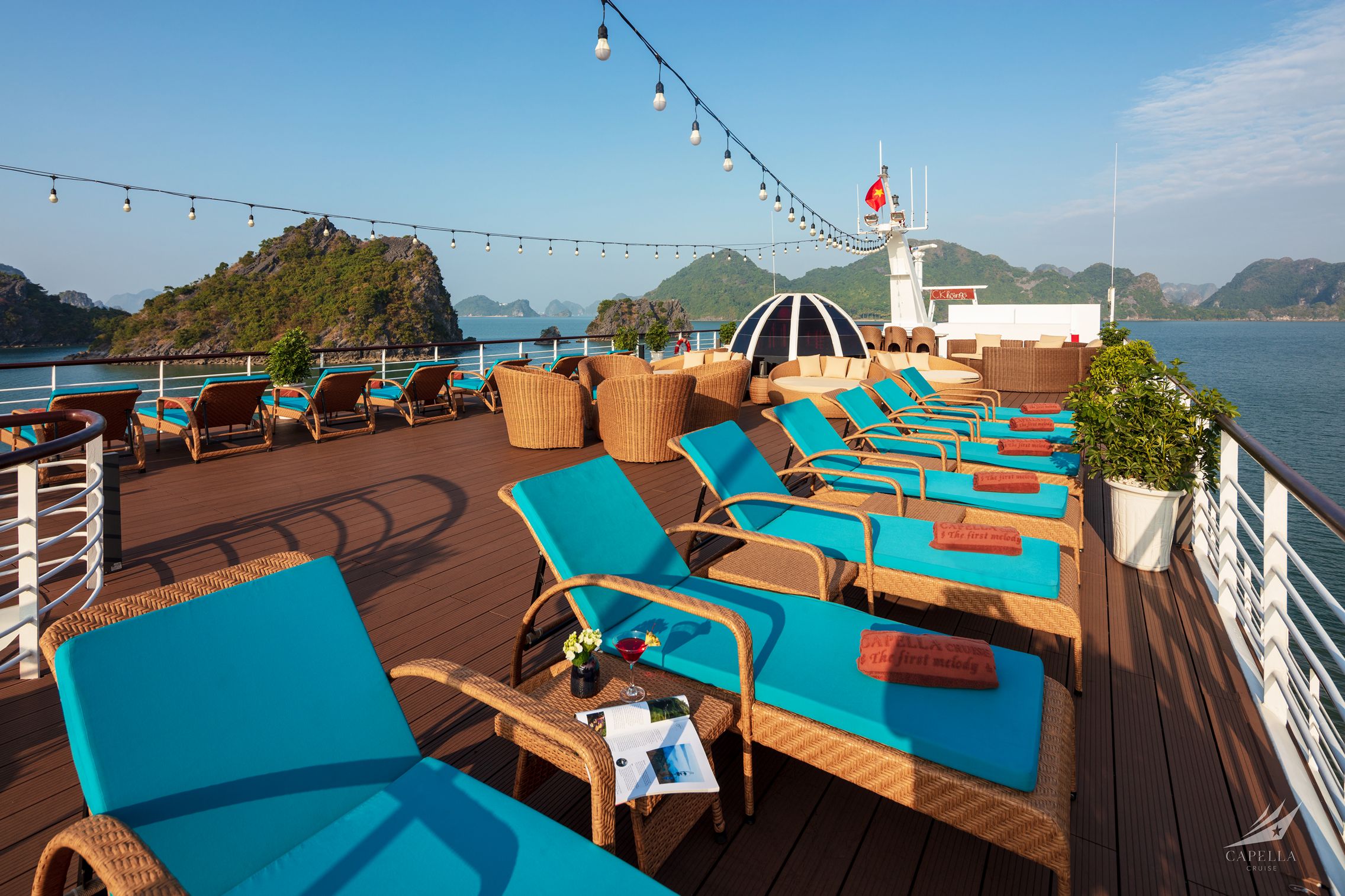 Capella Cruise is a modern luxury cruise featuring 30 stylish cabins and a wide range of high-end facilities. With exclusive designs, a water slide, Oasis pool, and entertainment lounges, the cruise offers both relaxation and fun for families, couples, and groups. The itinerary takes guests through Lan Ha Bay’s highlights with kayaking, swimming, cave exploration, and cultural activities.